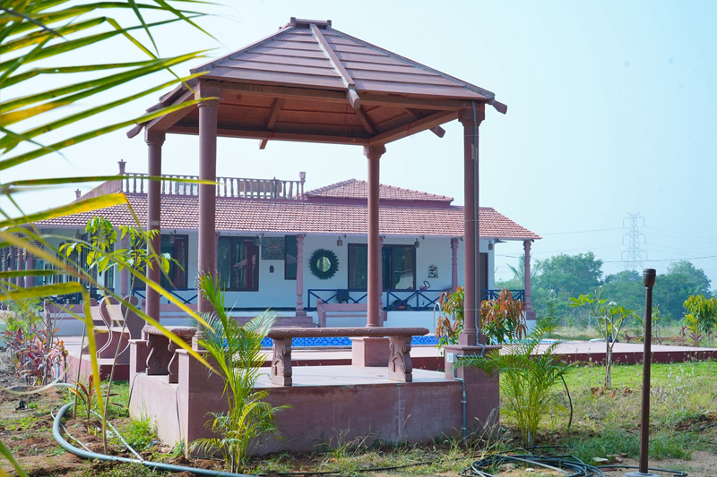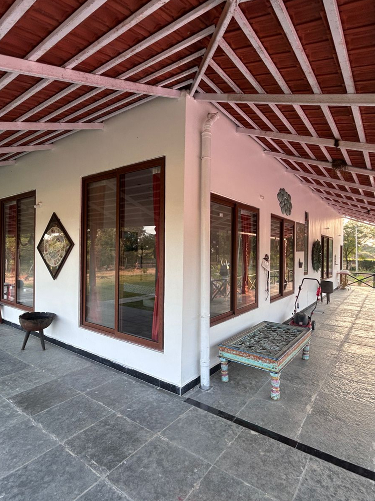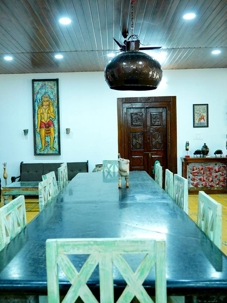 The living‑room at Rudra Farms feels like a curated gallery of heritage: antique teak sofas sit beneath a grand, carved stone pillar platform, while open shelves display delicate crockery from Jaipur and Jodhpur.